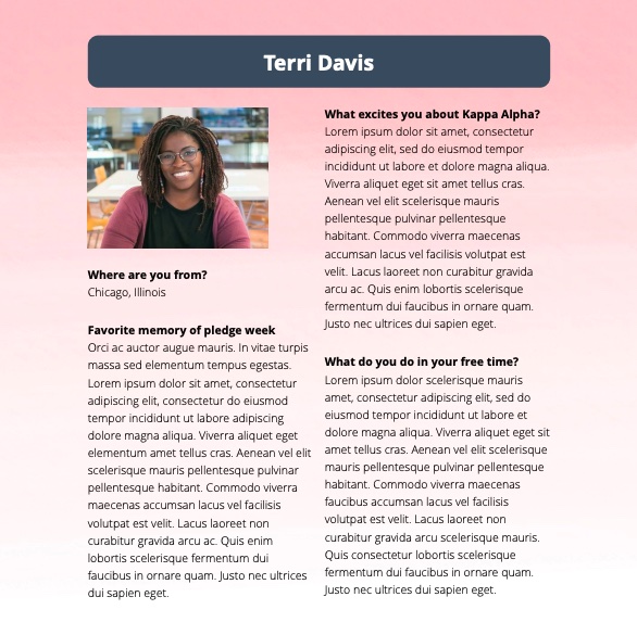 Edit contributions, add backgrounds, reorder pages, or add pictures. You’re in control of the look-and-feel! This can be done by a sorority officer or someone who wants to earn house points.
